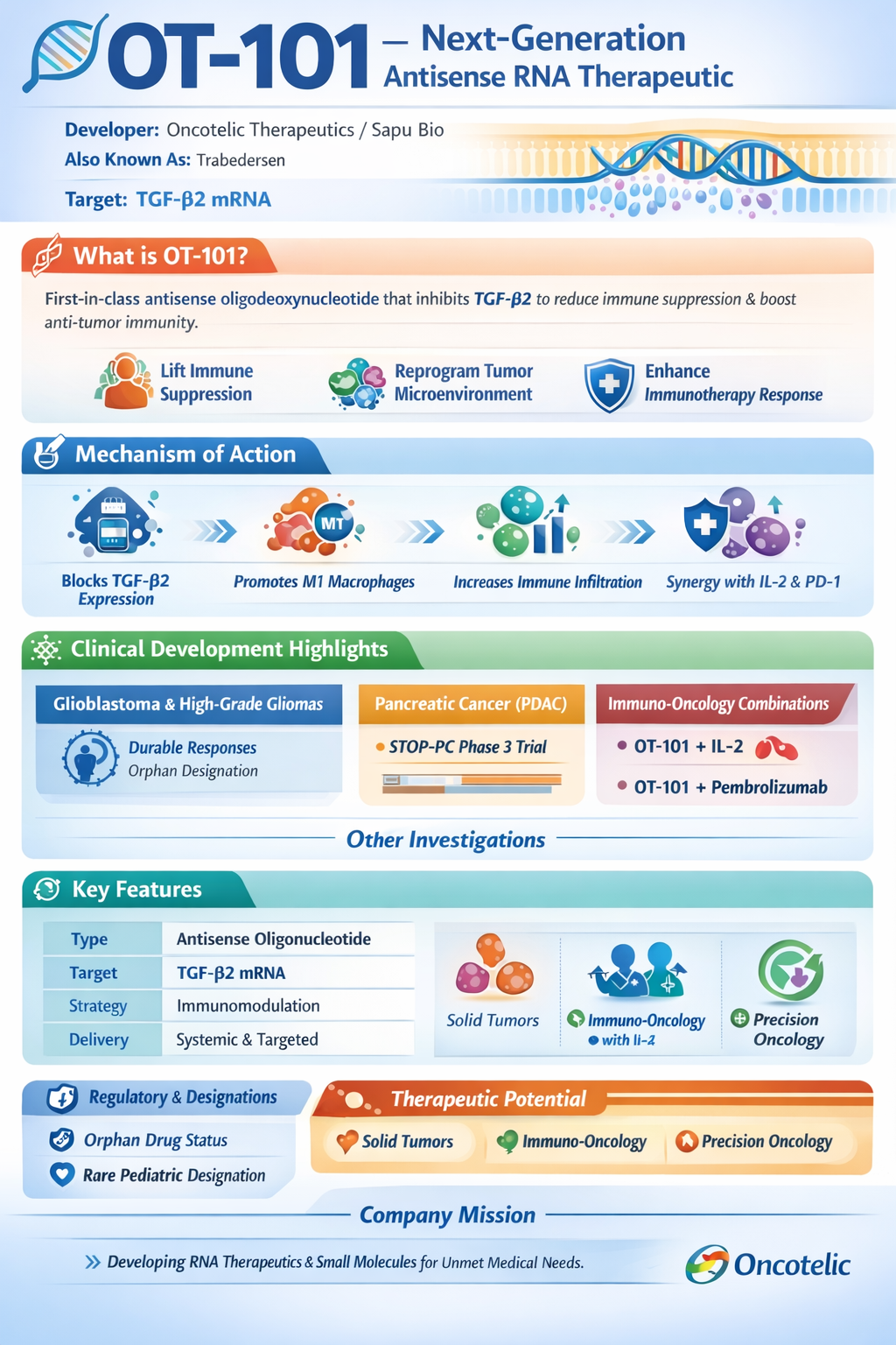 OT-101 (Trabedersen) is a novel phosphorothioate antisense oligodeoxynucleotide targeting TGF-β2 mRNA. TGF-β2 plays a crucial role in tumor immune evasion and progression. OT-101 has shown promising efficacy in early-phase clinical trials and is currently being evaluated in Phase 3 trials for multiple indications.